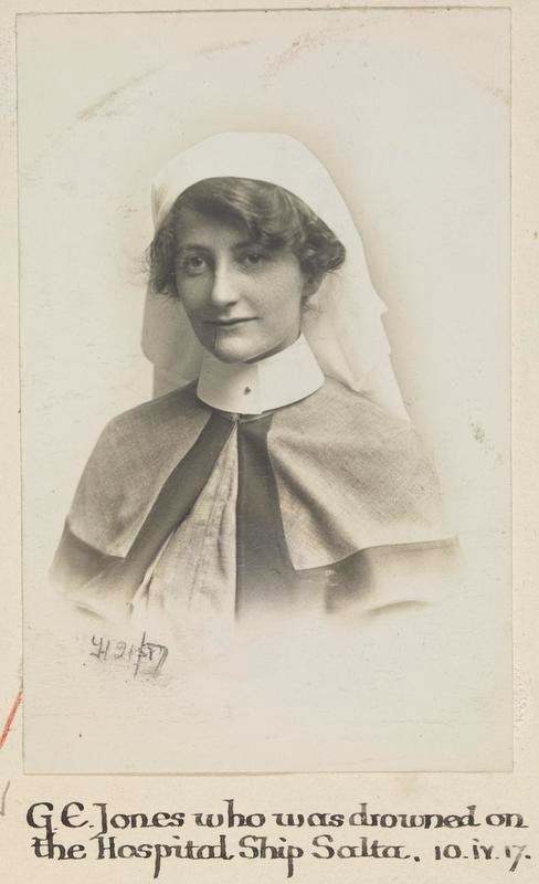 Miss Gertrude E Jones, Queen Alexandra's Imperial Military Nursing Service Reserve. Drowned when the Hospital Ship Salta struck a mine in the English Channel 10 April 1917.