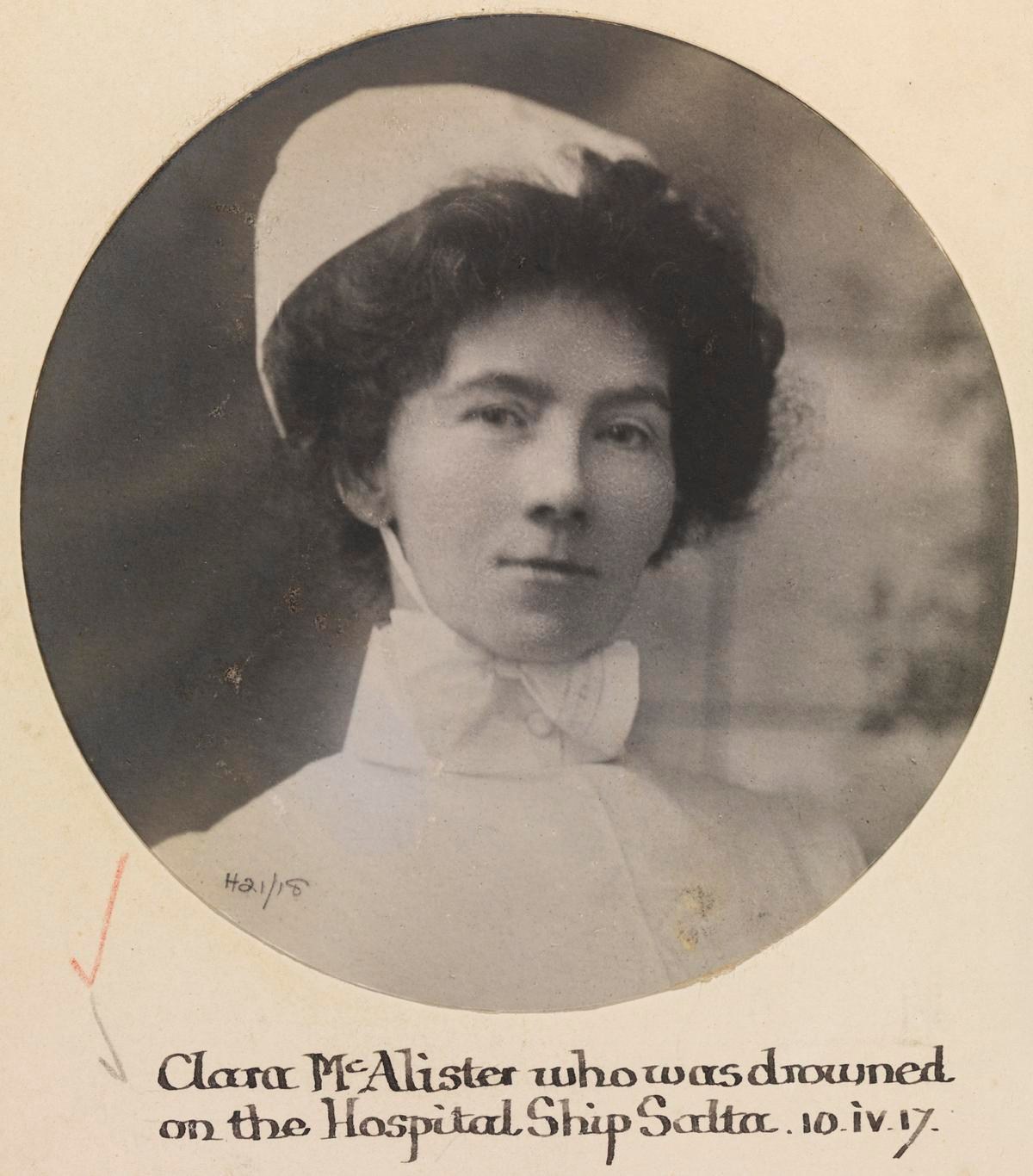 Staff Nurse Clara McAlister, Queen Alexandra's Imperial Military Nursing Service Reserve. Drowned when the Hospital Ship Salta struck a mine in the English Channel 10 April 1917.