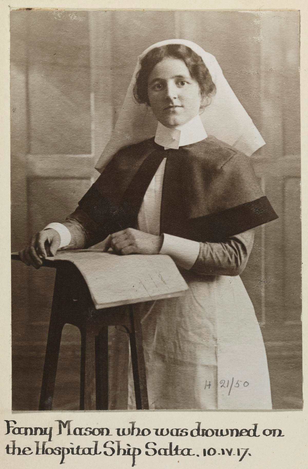 Staff Nurse Fanny Mason, Queen Alexandra's Imperial Military Nursing Service Reserve. Drowned when the Hospital Ship Salta struck a mine in the English Channel 10 April 1917.