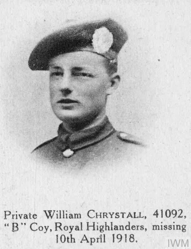 Private William Chrystall S/41092. Unit: B Company, 6th Battalion, Black Watch, Royal Highlanders. Death: 10 April 1918 Missing in action Western Front