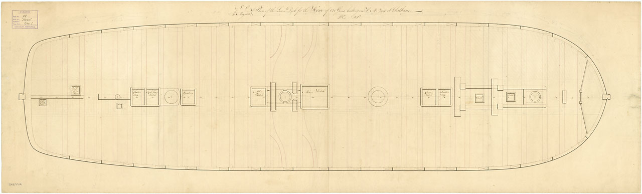 Howe (1815). Scale: 1:48. Plan showing the lower deck for Howe (1815), a 120-gun First Rate, three-decker, building at Chatham Dockyard.