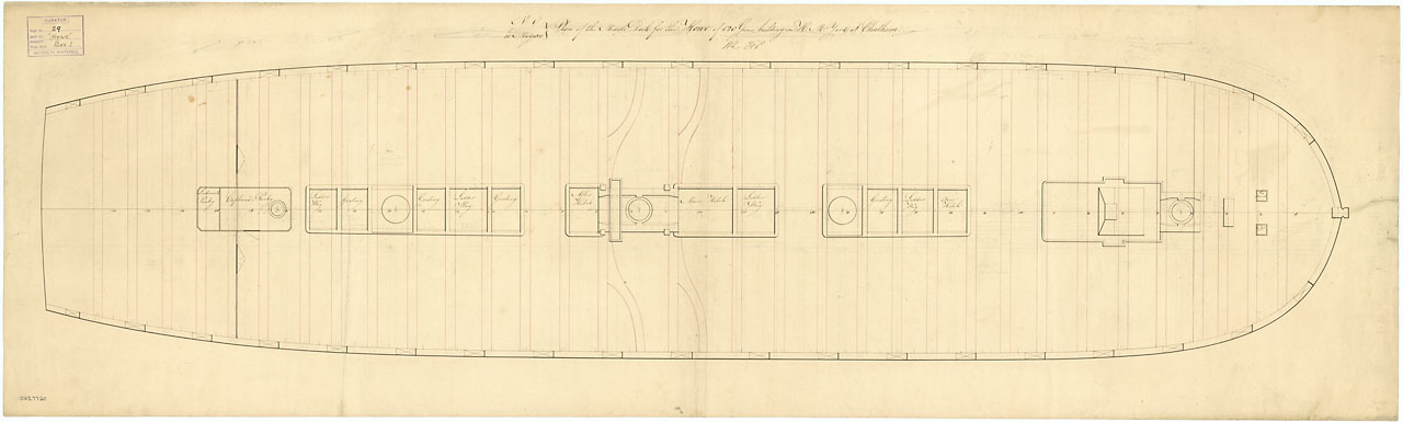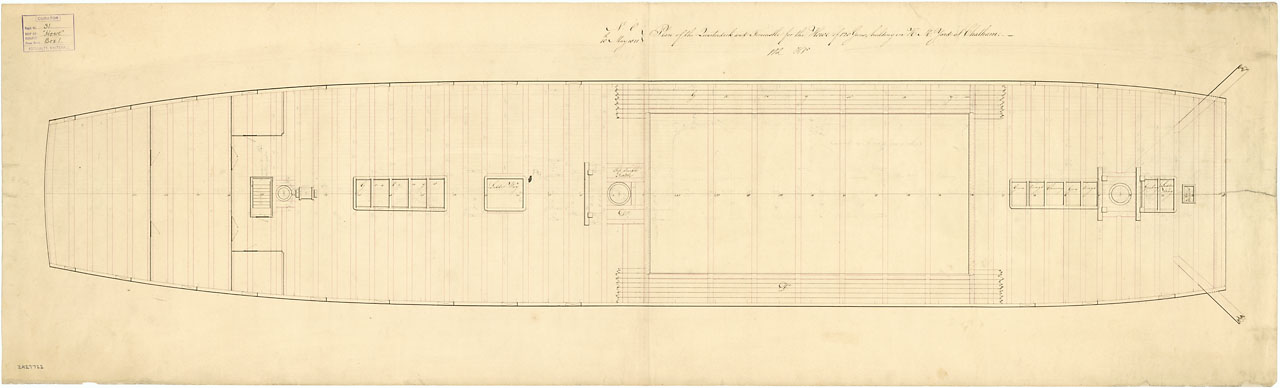 Howe (1815). Scale: 1:48. Plan showing the upper deck for Howe (1815), a 120-gun First Rate, three-decker, building at Chatham Dockyard.