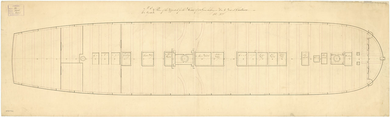Rochfort (1814) [alternative spelling: Rochefort]; Revenge (1805). Scale: 1:48. Plan showing the gun deck (lower deck) for Rochfort (1814), a 74-gun Third Rate, two-decker, as fitted at Sheerness Dockyard after repairs, and alterations for carrying a flag