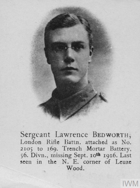 Sergeant Lawrence Bedworth 301314. Unit: 1st/5th Battalion, London Regiment (London Rifle Brigade), attached to the 169th Trench Mortar Battery, 56th Division. Death: 10 September 1916 Leuze Wood, Somme, Western Front. Commemorated on the Thiepval Memoria