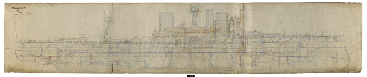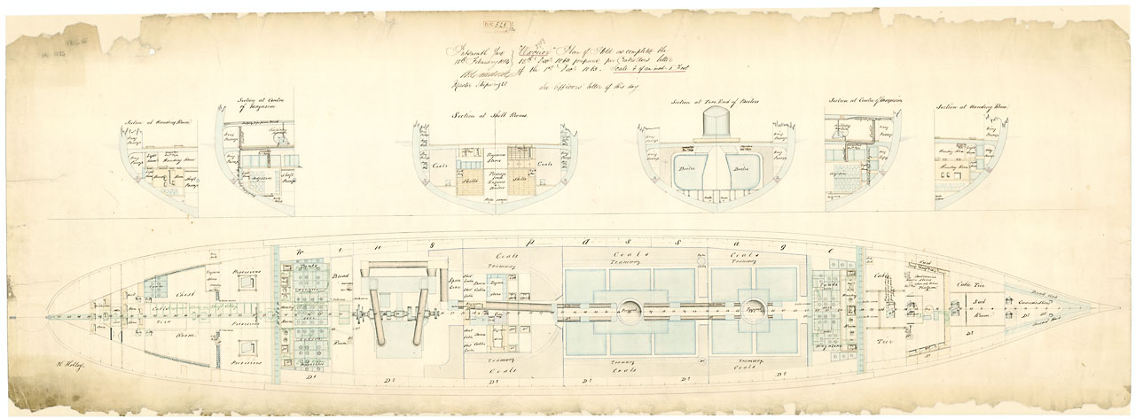 'Warrior' (1860). Scale 1:96. A plan showing the hold of the broadside ironclad 'Warrior' (1860), illustrating her as of 12 December 1863 on the completion of her refit. The plan includes sections through the fore and aft handing rooms