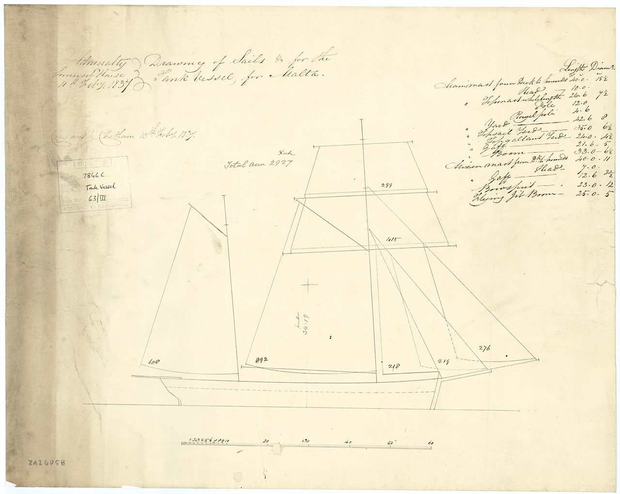 Tank Vessel No. 1 (1837). Scale: 1:96.  A plan showing the sail profile with mast and spar dimensions, and sail area, for Tank Vessel No. 1 (1837), a two-masted Water Carrier built for service in Malta.