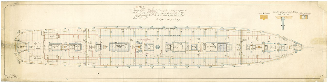 Ganges (1821). Scale: 1:48. Plan showing the starboard side plan view of the after cockpit illustrating the dispensary for Ganges (1821), an 84-gun Second Rate, two-decker, as 'pointed out' by Admiral Sir Robert Stopford [Admiral of the Blue, se