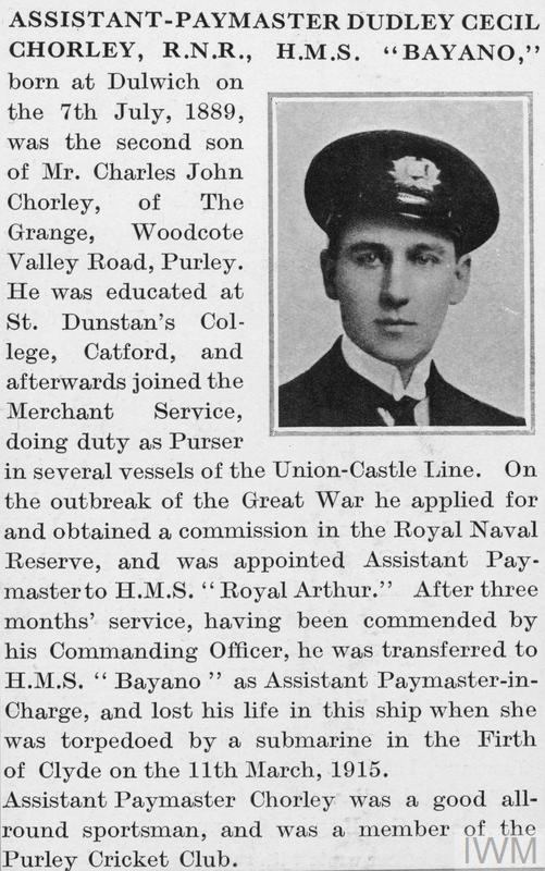 Assistant Paymaster Dudley Cecil Chorley. Unit: Royal Naval Reserve, HMS Bayano. Death: 11 March 1915 Killed in action Firth of Clyde