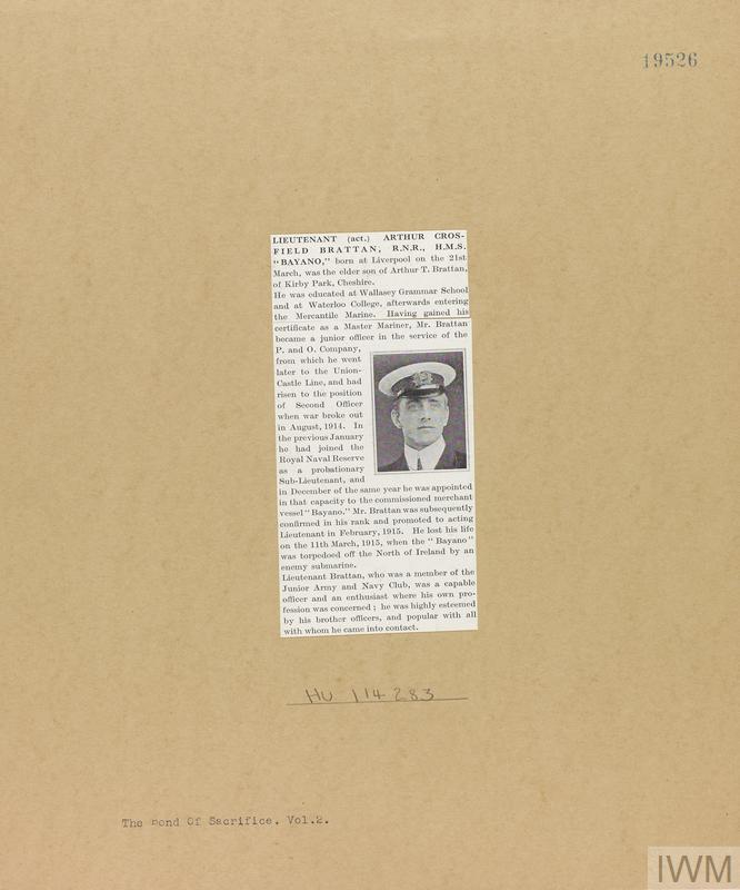 Lieutenant Arthur Crossfield Brattan. Unit: HMS Bayano, Royal Naval Reserve. Death: 11 March 1915 At Sea North of Ireland