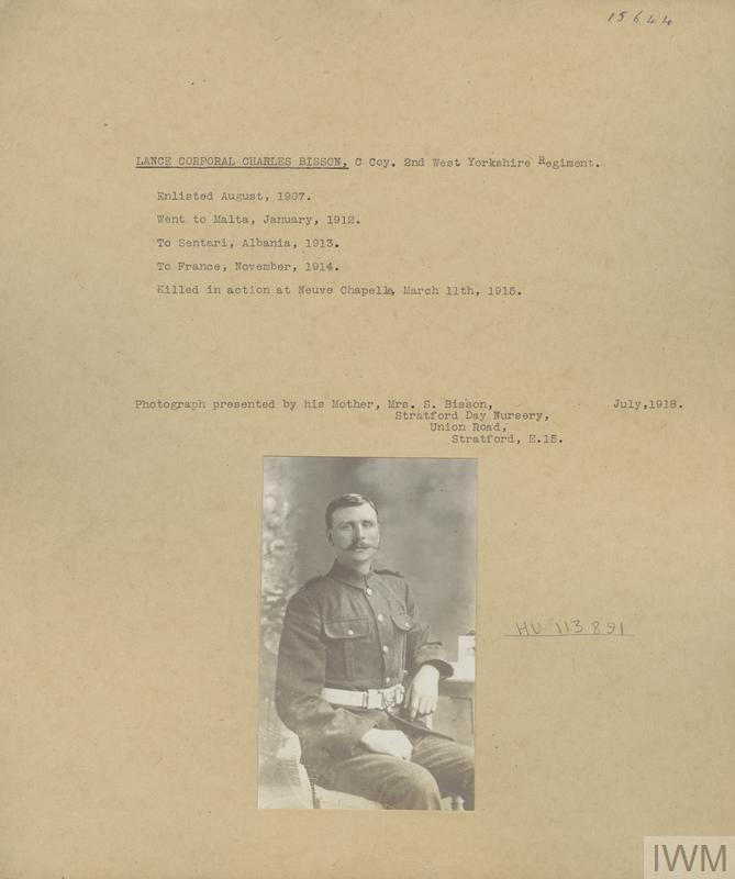 Lance Corporal Charles Bisson 8601. Unit: C Company, 2nd Battalion, West Yorkshire Regiment (Prince of Wales's Own). Death: 11 March 1915 Neuve Chapelle Western Front