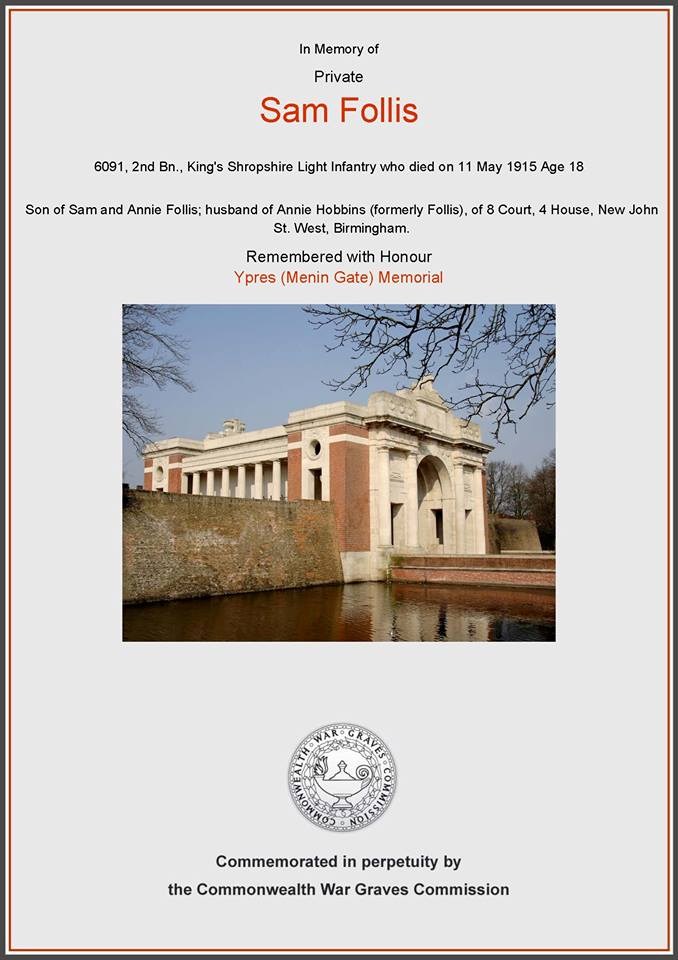 Private Sam Follis 6091, King's Shropshire Light Infantry