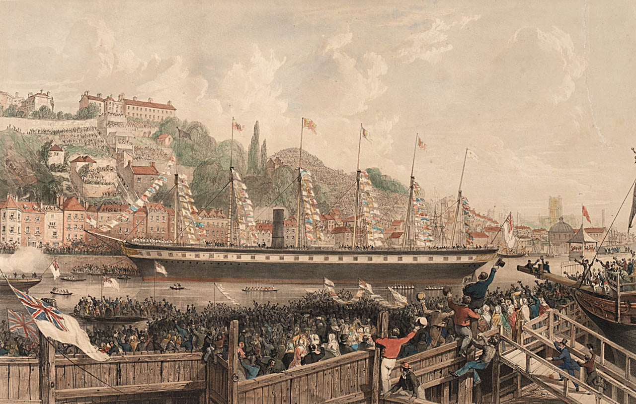 The Launch of the Iron Steam Ship Great Britain, 19th July 1843. This hand-coloured lithograph depicts the launch by Prince Albert on 19th July 1843 of the famous steamship ‘Great Britain’, which was designed by Isambard Kingdom Brunel and bui