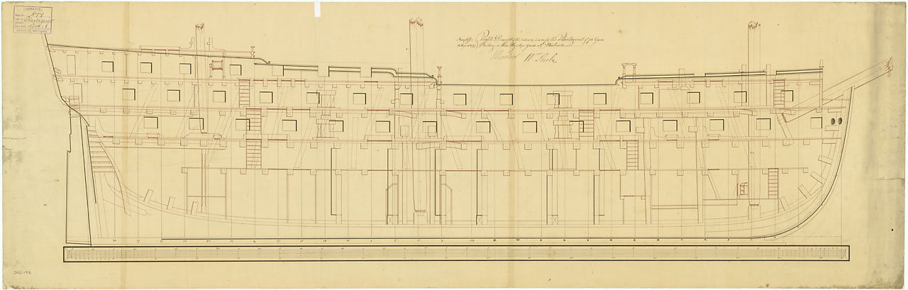 'Plantagenet' (1801). Scale: 1:48. Plans showing the inboard profile for 'Plantagenet' (1801), a 74-gun Third Rate, two-decker, building at Woolwich Dockyard.