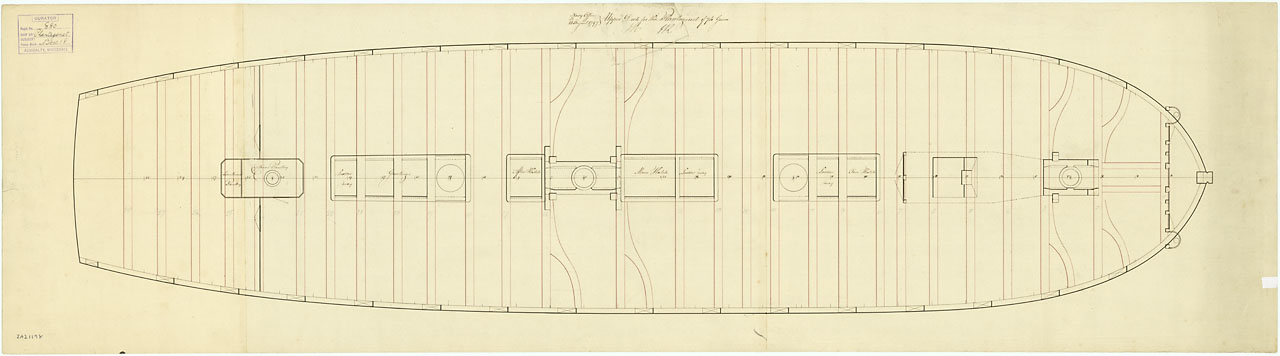 'Plantagenet' (1801). Scale: 1:48. Plan showing the upper deck for 'Plantagenet' (1801), a 74-gun Third Rate, two-decker, building at Woolwich Dockyard.