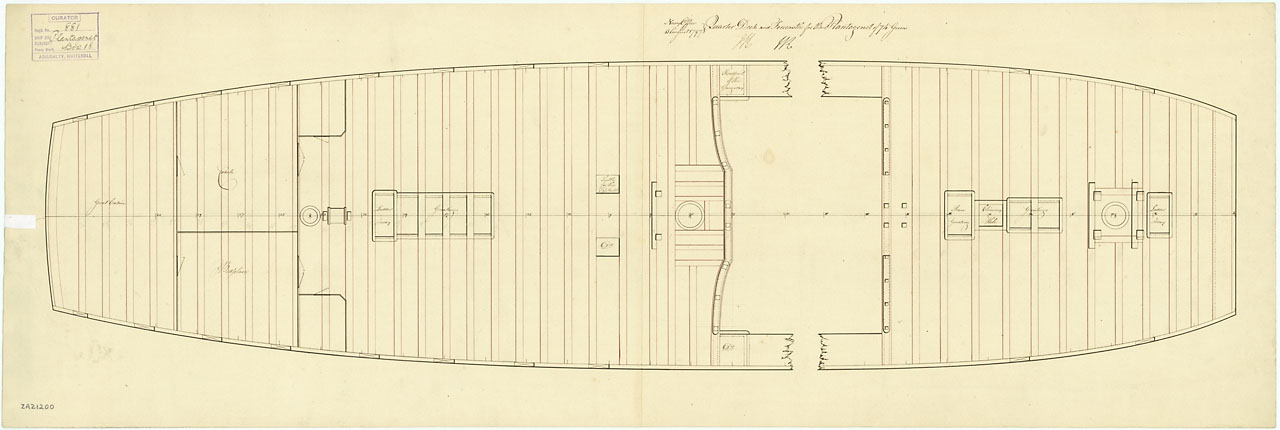 'Plantagenet' (1801). Scale: 1:48. Plan showing the quarterdeck and forecastle for 'Plantagenet' (1801), a 74-gun Third Rate, two-decker, prior to the modifications to the carronade ports on the quarterdeck.