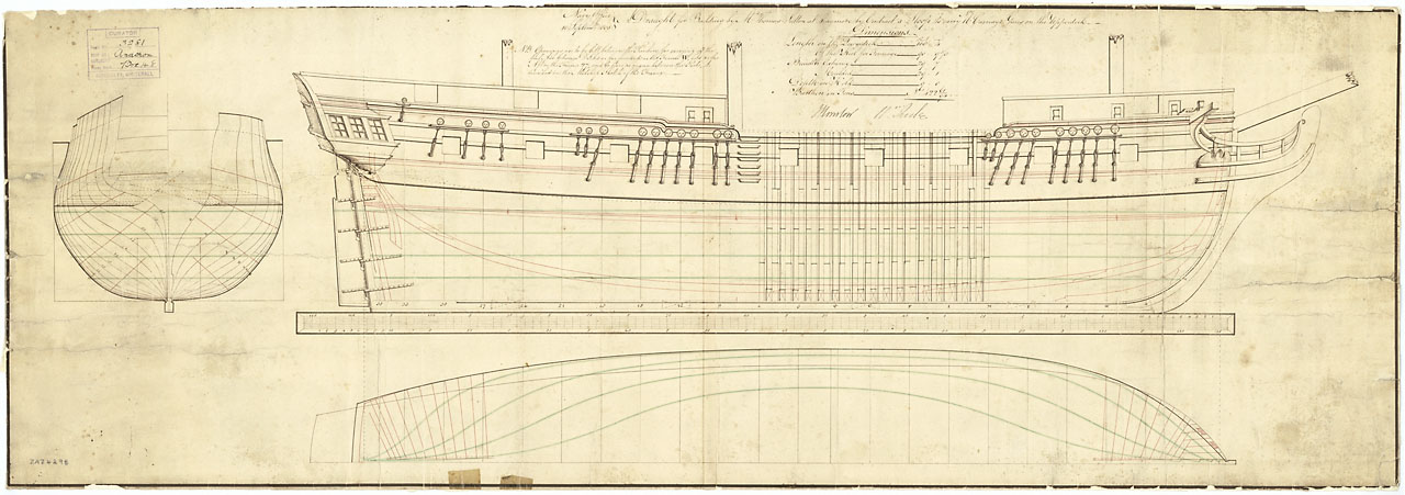 Anacreon (1813). Scale: 1:48.  Plan showing the body plan, sheer lines with midship framing, and longitudinal half-breadth for building Anacreon (1813), a 16-gun (later 22-gun) Ship Sloop.  The vessel was originally started by Thomas Sutton before being d