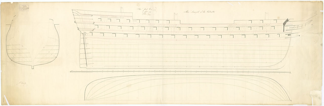 Calcutta (1831). Scale: 1:48. Plan showing the body plan, sheer lines, and longitudinal half-breadth for Calcutta (1831), an 80-gun Second Rate, two-decker, as taken off at Plymouth Dockyard in 1838.