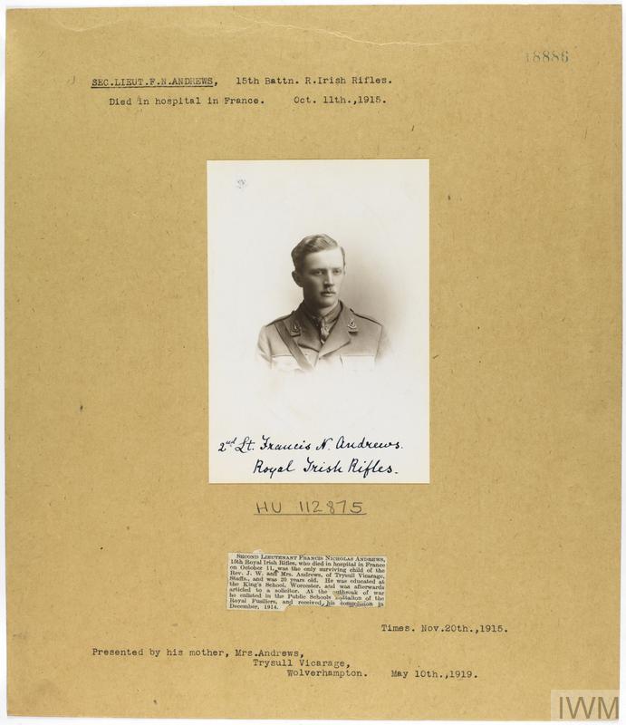 Second Lieutenant Francis Nicholas Andrews. Unit: 15th Battalion, Royal Irish Rifles. Death: 11 October 1915 Western Front