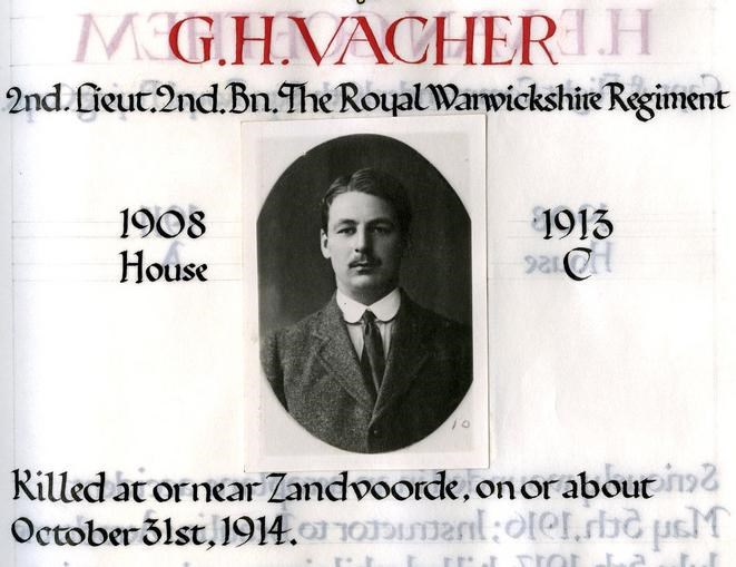 Second Lieutenant George Herbert Vacher. Unit: 4th (atached 2nd) Battalion, Royal Warwickshire Regiment. Death: 11 November 1914 Near Zandvoorde Western Front