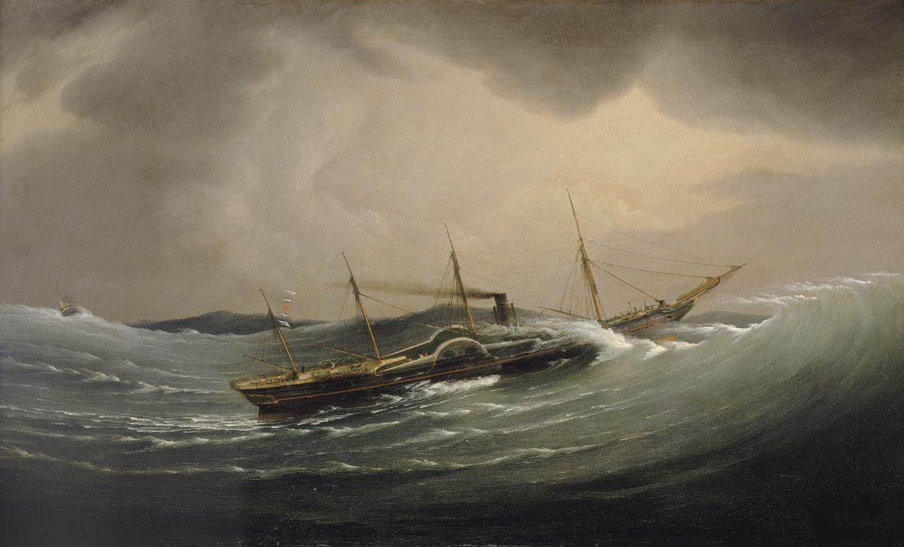 The 'Great Western' riding a tidal wave, 11 December 1844. A portrait of the wooden paddle steamer ‘The Great Western’. Built by Brunel, she was the first of his three steamships and pioneered the steam deep water passenger trade. Sh