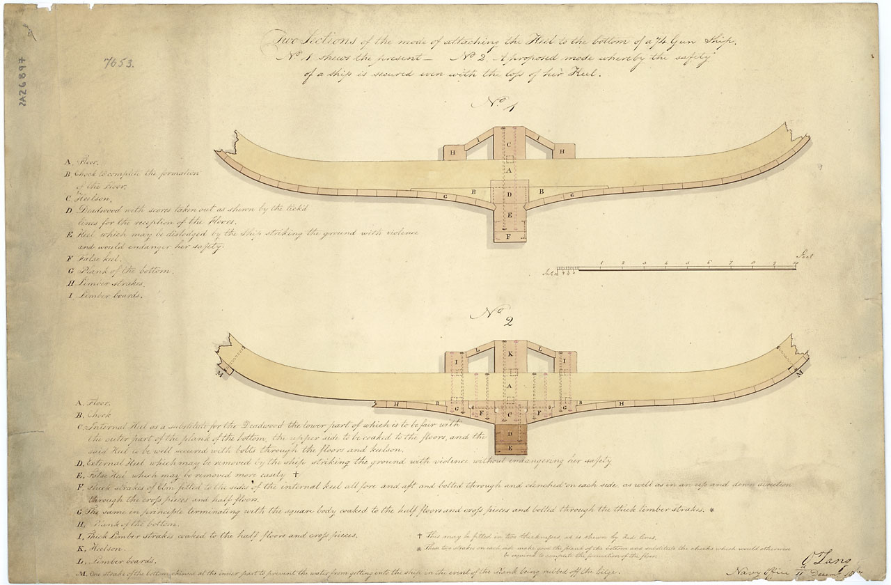 Proposed new method of fixing keels to 74 gun ships. 1:24. Plan showing a section illustrating the present method of fixing the keel to 74 gun, Third Rates, and a section illustrating the proposed method of fixing the keel to a 74 gun ship, where the shi