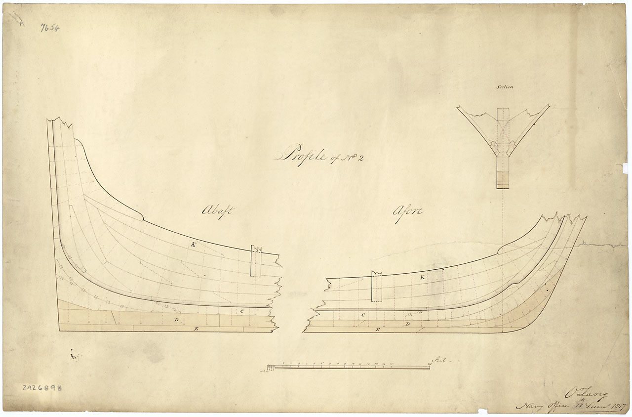 Proposed new method of fixing keels to 74 gun ships. Scale: 1:48. Plan showing the keel profiles for the stern and bow, and a section, illustrating the proposed new method of fixing keels to 74 gun Third Rate two-deckers.