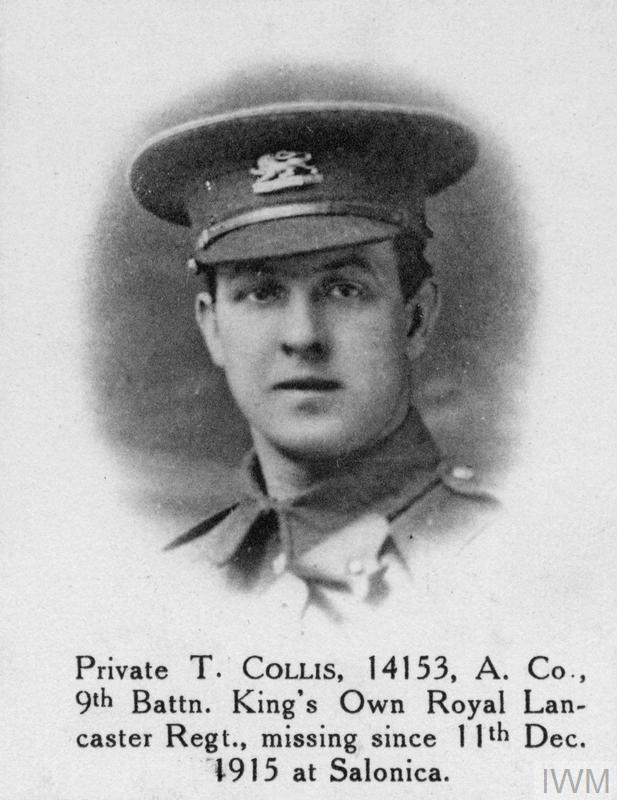 Private Thomas Collis 14153. Unit: "A" Company, 9th Battalion, King's Own (Royal Lancaster Regiment). Death: 11 December 1915, missing in action, Macedonia.