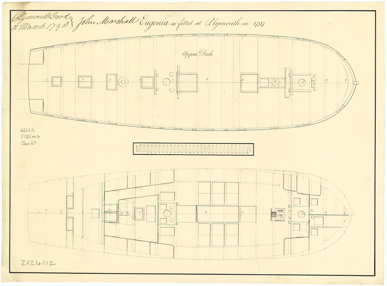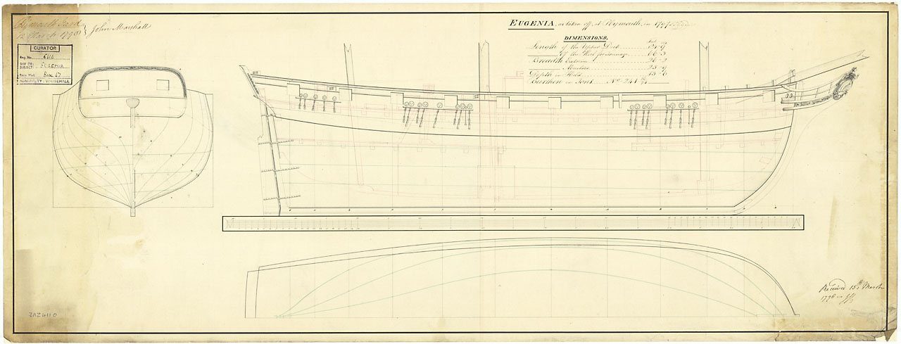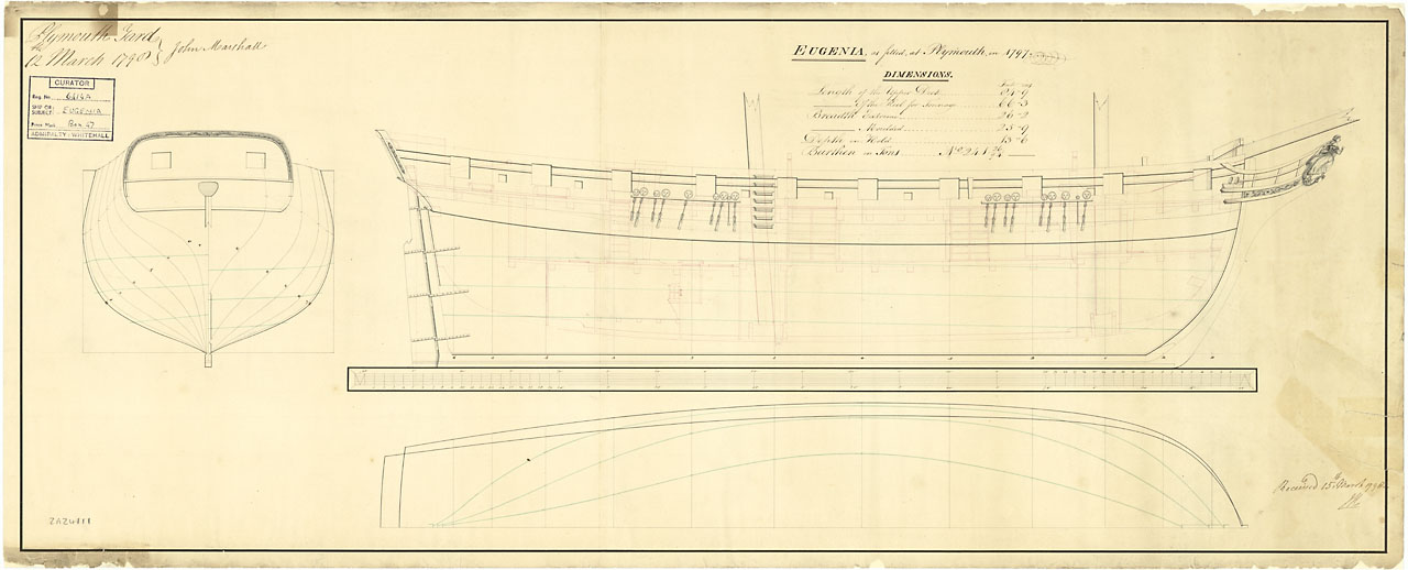 Eugenia (captured 1797). Scale: 1:48. Plan showing the body plan with stern board outline and some decoration detail, sheer lines with inboard detail and figurehead, and long longitudinal half-breadth for Eugenia (captured 1797), a captured French privat