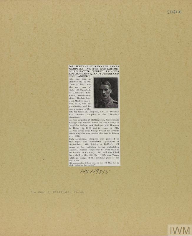 Second Lieutenant Kenneth James Campbell. Unit: 9th Battalion, Argyll and Sutherland Highlanders. Death: 12 May 1915 Killed in action near Ypres Western Front