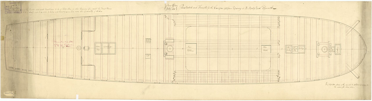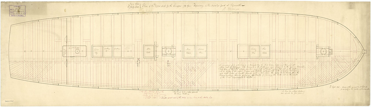 Canopus (1798). Scale: 1:48. Plan showing the upper deck for Canopus (1798), a captured French Third Rate, as fitted as a 80-gun Third Rate, two-decker and undergoing repair at Plymouth.  Between March 1814 and March 1815 Canopus underwent a Large Repair