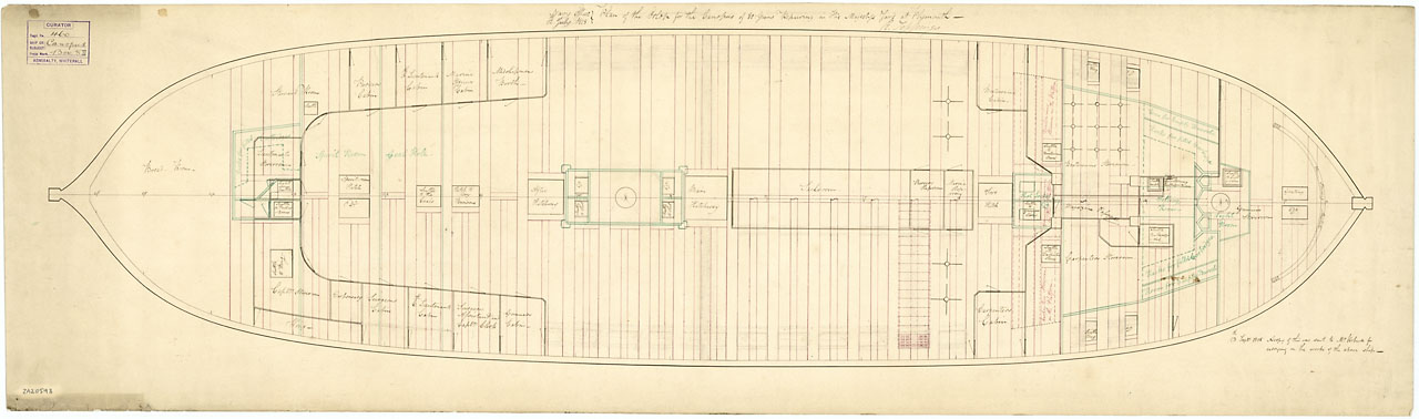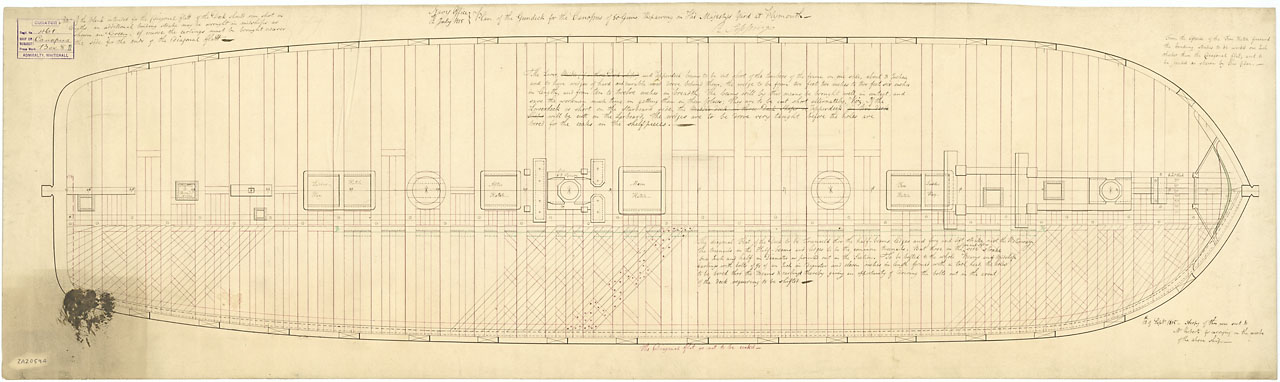 Canopus (1798). Scale: 1:48. Plan showing the gun deck (lower deck) for Canopus (1798), a captured French Third Rate, as fitted as a 80-gun Third Rate, two-decker and undergoing repair at Plymouth. Between March 1814 and March 1815 Canopus underwent a lar