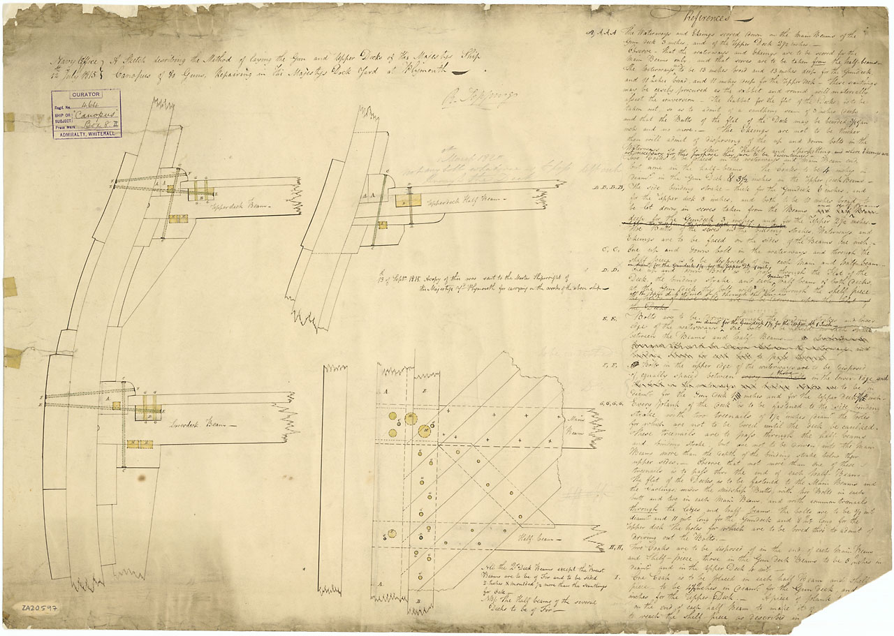 Canopus (1798). Scale: 1:24. Plan showing sections to illustrate the method of bolting the side timbers to the beams for Canopus (1798), a captured French Third Rate, as fitted as a 80-gun Third Rate, two-decker and undergoing repair at Plymouth. Between