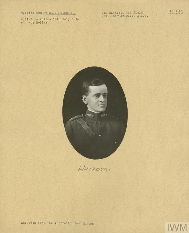Captain Robert Clive Crocker. Unit: 6th Battery, 2nd Field Artillery Brigade, Australian Imperial Force. Death: 12 July 1915 Killed in action at Cape Helles Gallipoli