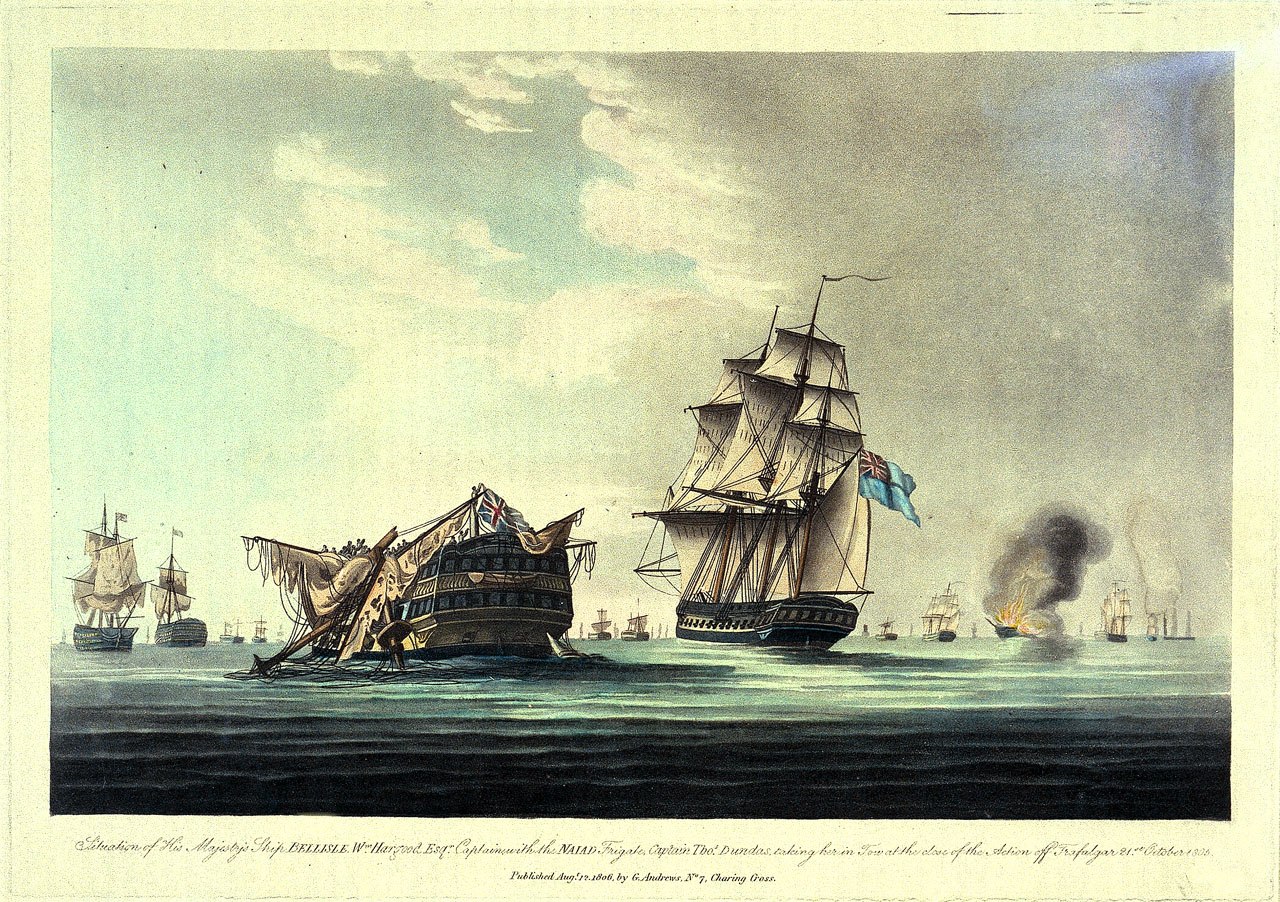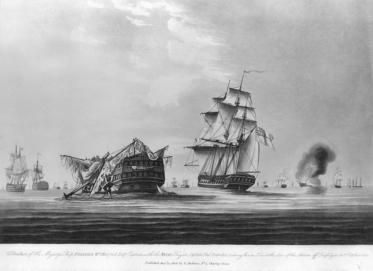 'Belleisle' at the close of the Action off Trafalgar, 21 October 1805. Inscribed: “Situation of His Majesty's Ship BELLISLE [sic], Wm Hargood Esqr Captain, with the NAIAD Frigate, Captain Thos Dundas, taking her in Tow at the close of