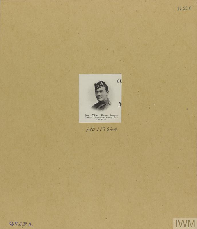 Captain William Thomas Carter. Unit: 7th Battalion, Seaforth Highlanders. Death: 12 October 1916, missing, Somme, Western Front. Commemorated on the Thiepval Memorial.