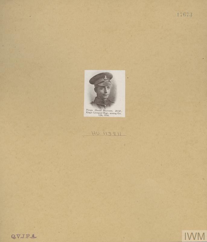 Private Harold Billyard 26147. Unit: 17th Battalion, the King's (Liverpool Regiment). Death: 12 October 1916, missing, Somme, Western Front. Commemorated on the Thiepval Memorial.