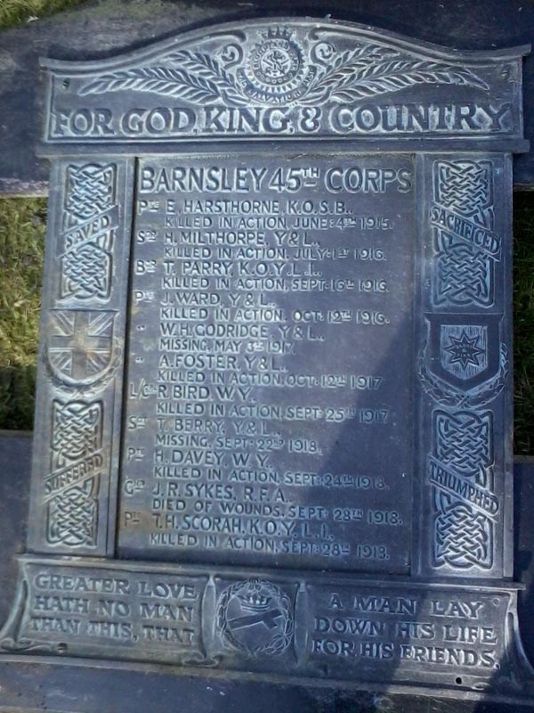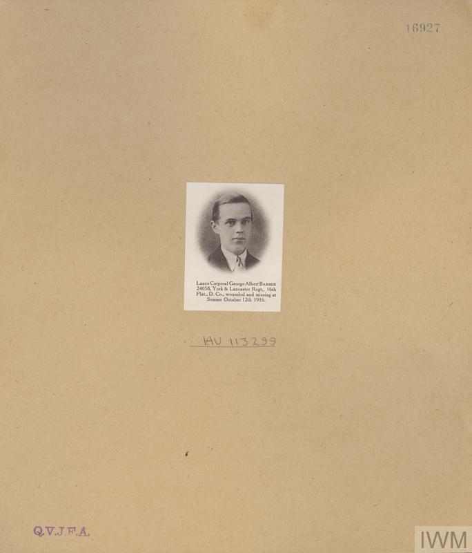 Lance Corporal George Albert Barber 24058. Unit: 16th Platoon, "D" Company, 2nd Battalion, York and Lancaster Regiment. Death: 12 October 1916, Somme, Western Front. Commemorated on the Thiepval Memorial.