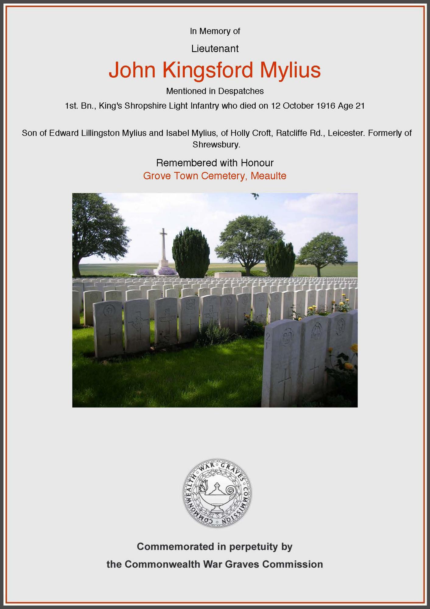 Second Lieutenant J K Mylius , Shropshire Light Infantry