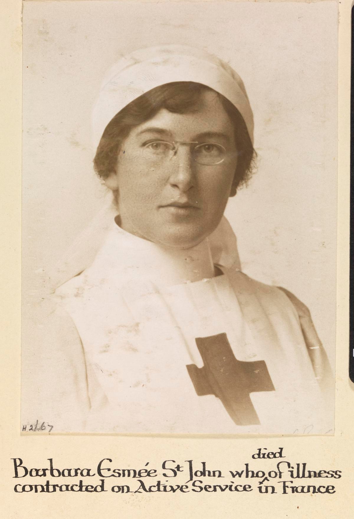 Miss Barbara Esmée St John, Voluntary Aid Detachments. Died of illness contracted on active service in France 12 October 1916.