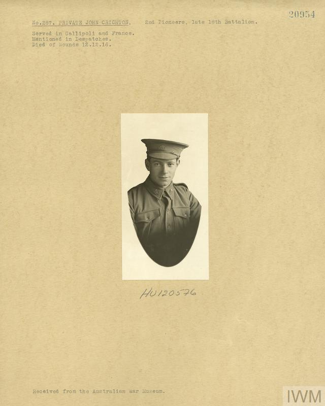 Private John Crichton 287. Unit: 18th Battalion, attached to 2nd Pioneers, Australian Imperial Force. Death: 12 December 1916 Died of wounds Western Front