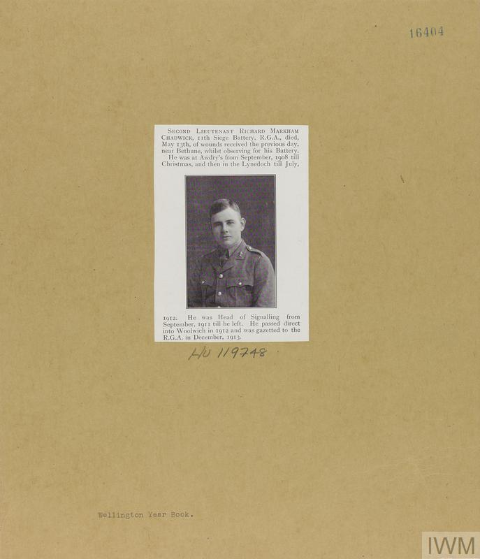Second Lieutenant Richard Markbarn Chadwick. Unit: 11th Siege Battery, Royal Garrison Artillery. Death: 13 May 1915 Died of wounds near Bethune Western Front