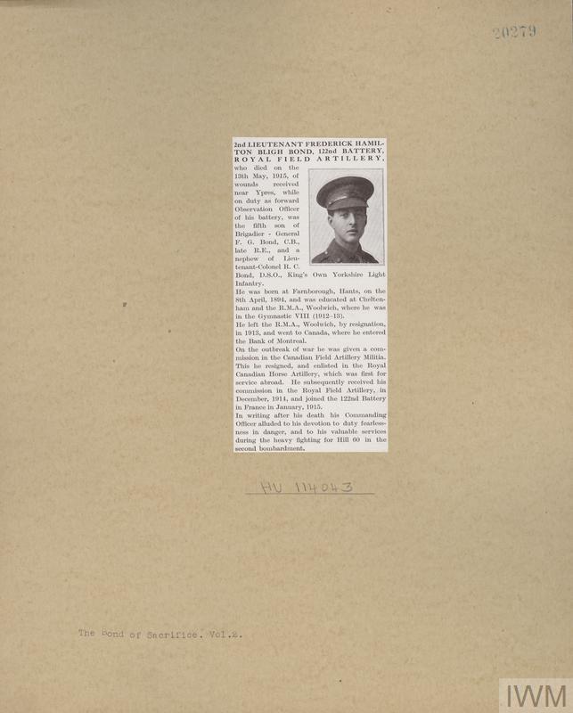 Second Lieutenant Frederick Hamilton Bligh Bond. Unit: 122nd Battery, Royal Field Artillery. Death: 13 May 1915 Ypres Western Front