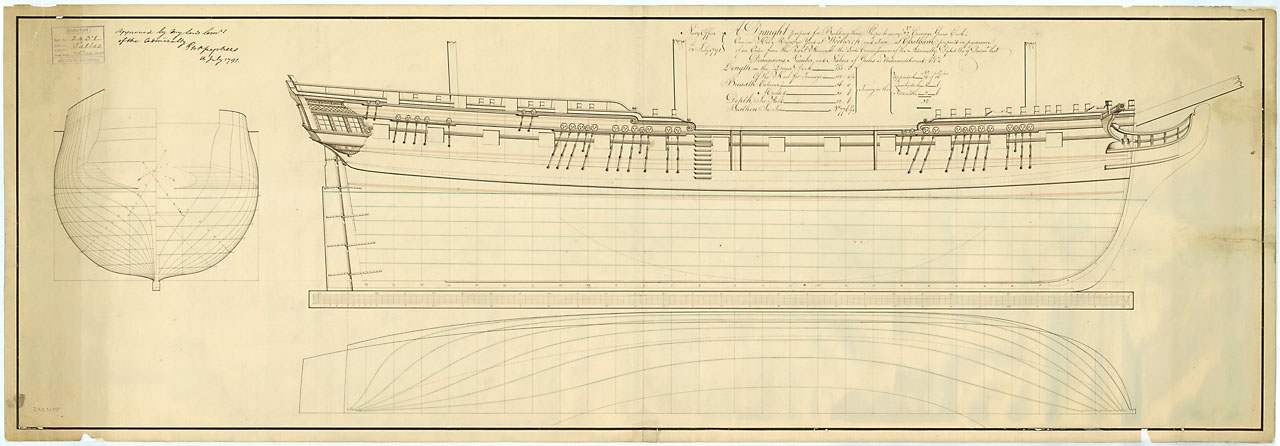 Pallas (1793), Stag (1793), Unicorn (1734). Scale 1:48. Plan showing the body plan, sheer lines, longitudinal half-breadth as proposed (and approved) for building Pallas (1793), Stag (1793), Unicorn (1734), all 32-gun, Fifth Rate Frigates.