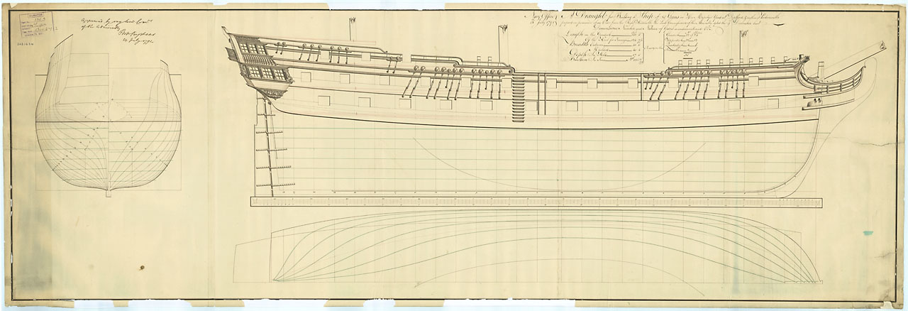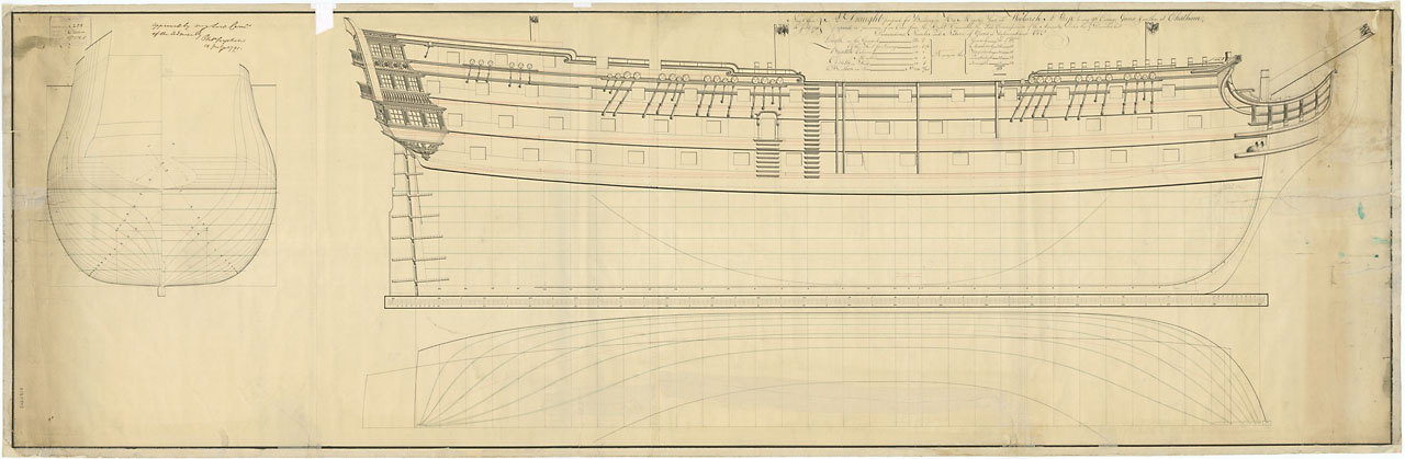 Cambridge (1755). Scale: 1:48. Plan showing the stern board outline, outboard profile from the upper side of the main deck for the Cambidge (1755), an 80-gun Third Rate, three decker. The illustrates the proposed and fitted alterations to remove the round