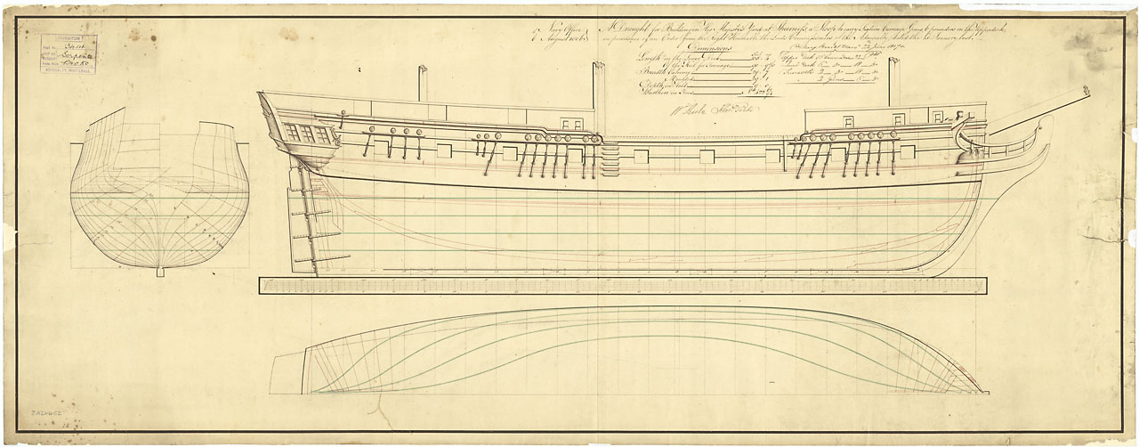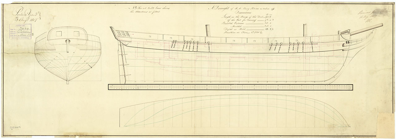 Pelican (captured 1806). Scale: 1:48.  Plan showing the body plan with stern board outline, sheer lines with inboard detail, and longitudinal half-breadth for Pelican (captured 1806), a captured French Brig, as taken off.  The dotted red lines illustrate