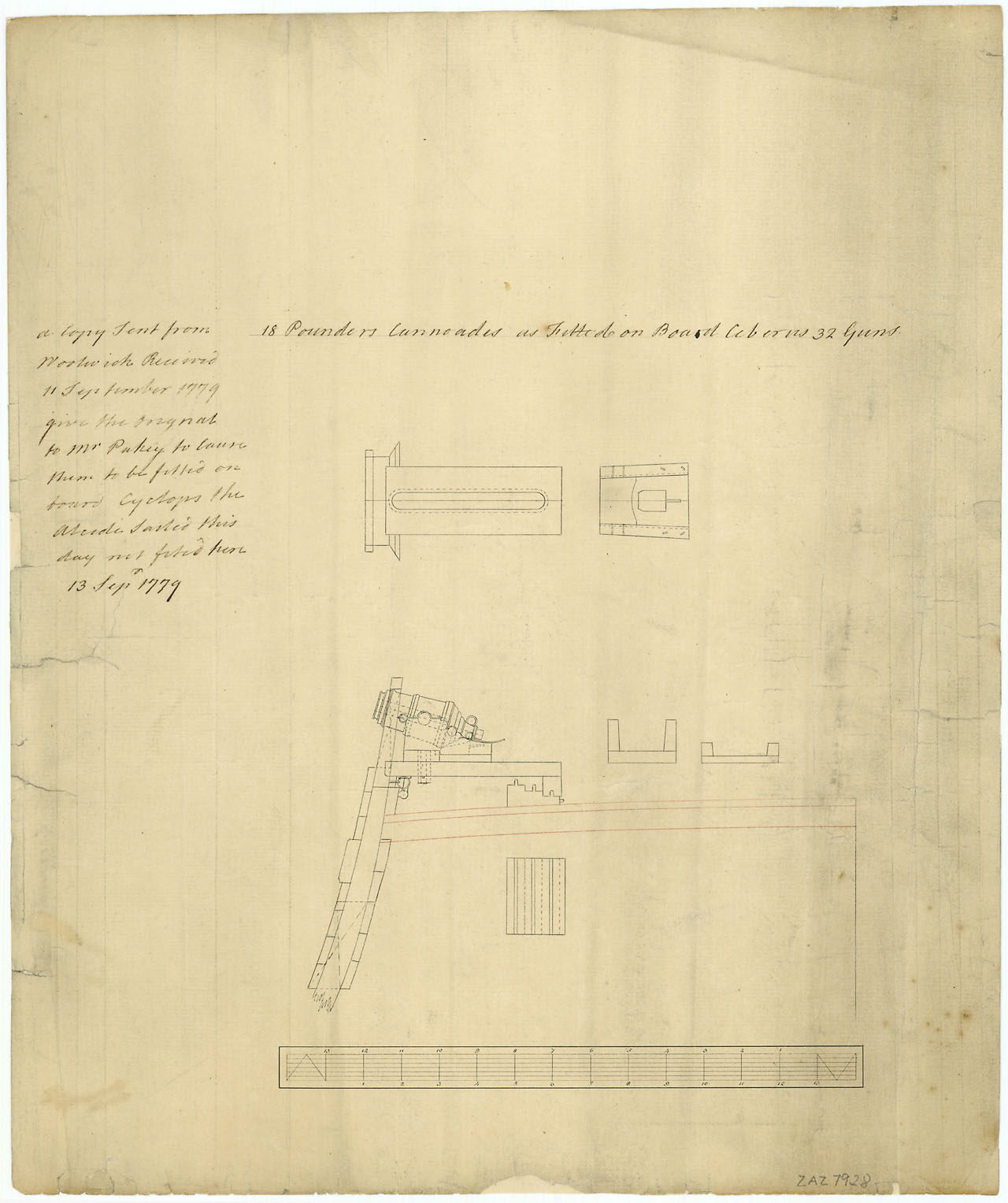 Cerberus'(1779); Alcide (1779); Cyclops (1779). Scale: 1:24. Plan showing a plan and side elevation through the deck for an 18 pounder carronade mounted on the 'inside' principle, for Cerberus (1779), a 32-gun Fifth Rate frigate and Cyclops