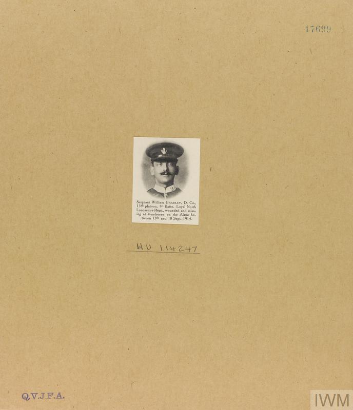 Sergeant William Bradley 3930. Unit: 13th Platoon, D Company, 1st Battalion, Loyal North Lancashire Regiment. Death: 13 September 1914 Vendresse on the Aisne Western Front