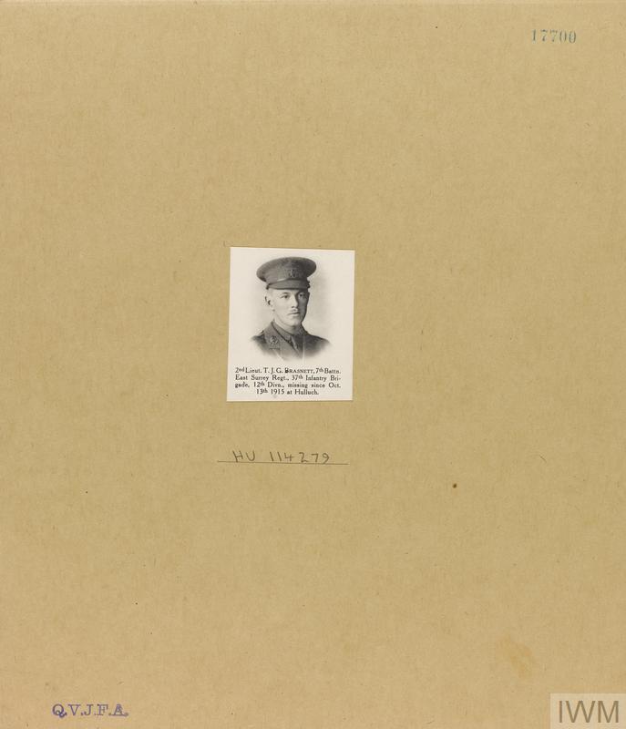 Second Lieutenant Thomas John Grose Brasnett. Unit: 7th Battalion, East Surrey Regiment, 27th Infantry Brigade, 12th Division. Death: 13 October 1915 Hulluch
