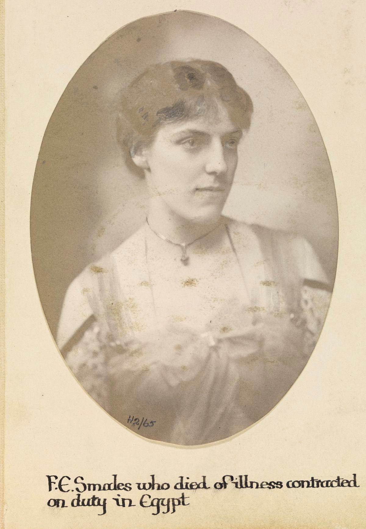Miss F E Smales, Voluntary Aid Detachments. Died of illness contracted on duty in Egypt 13 October 1915.