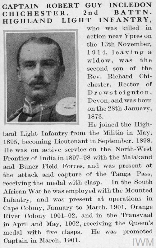 Captain Robert Guy Incledon Chichester. Unit: 2nd Battalion, Highland Light Infantry. Death: 13 November 1914 Killed in action near Ypres Western Front